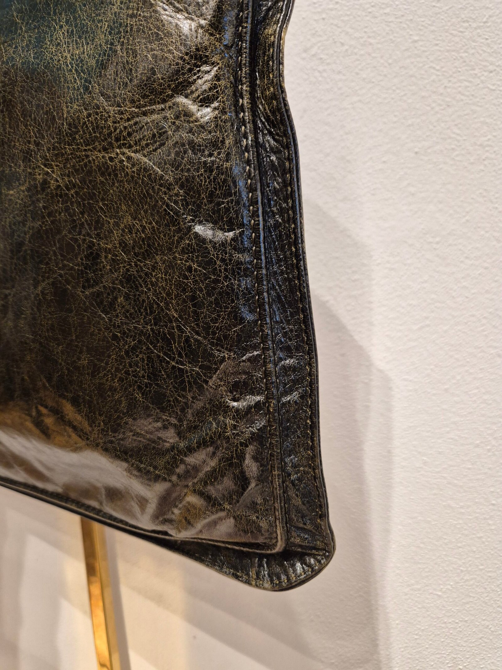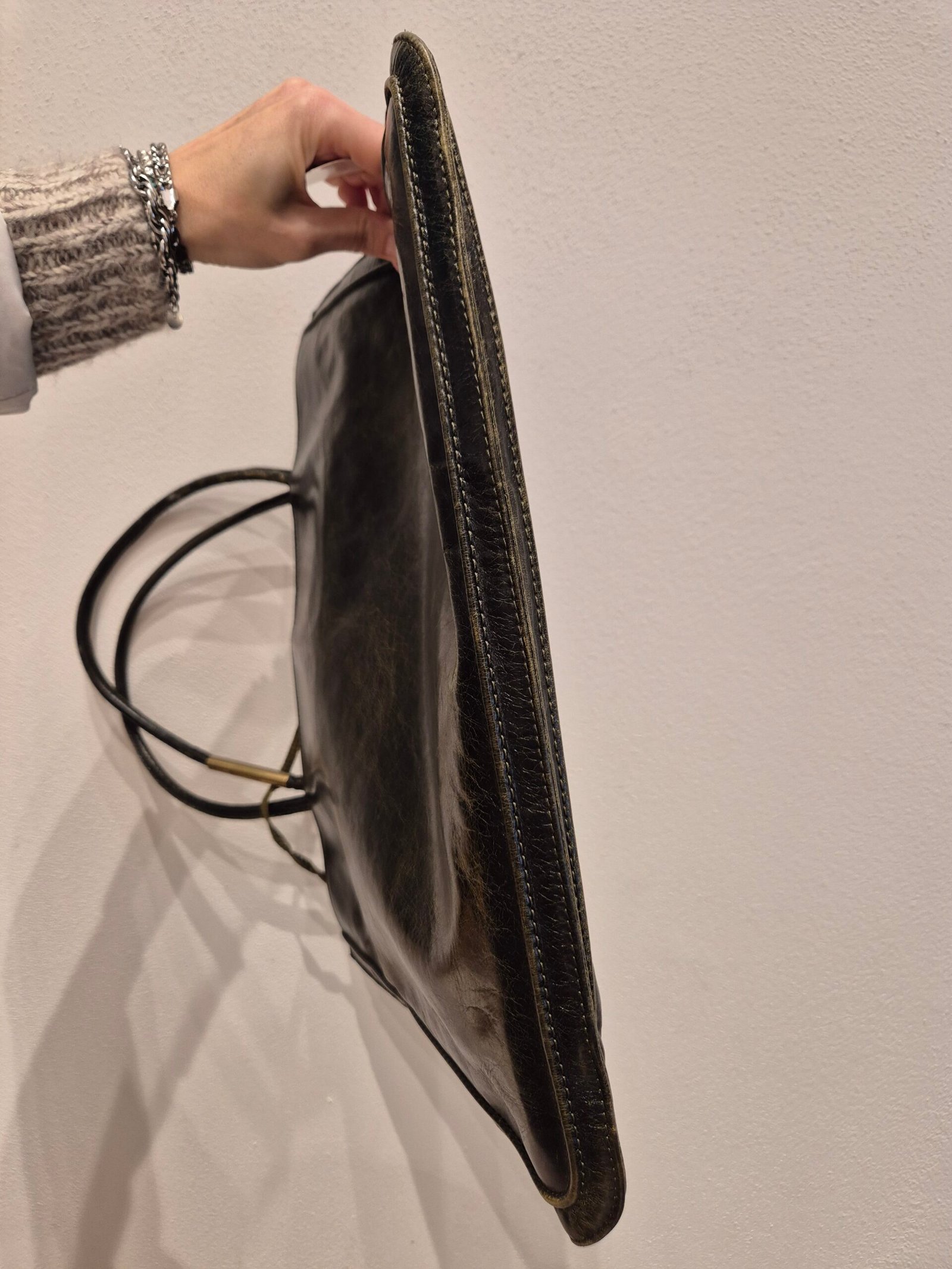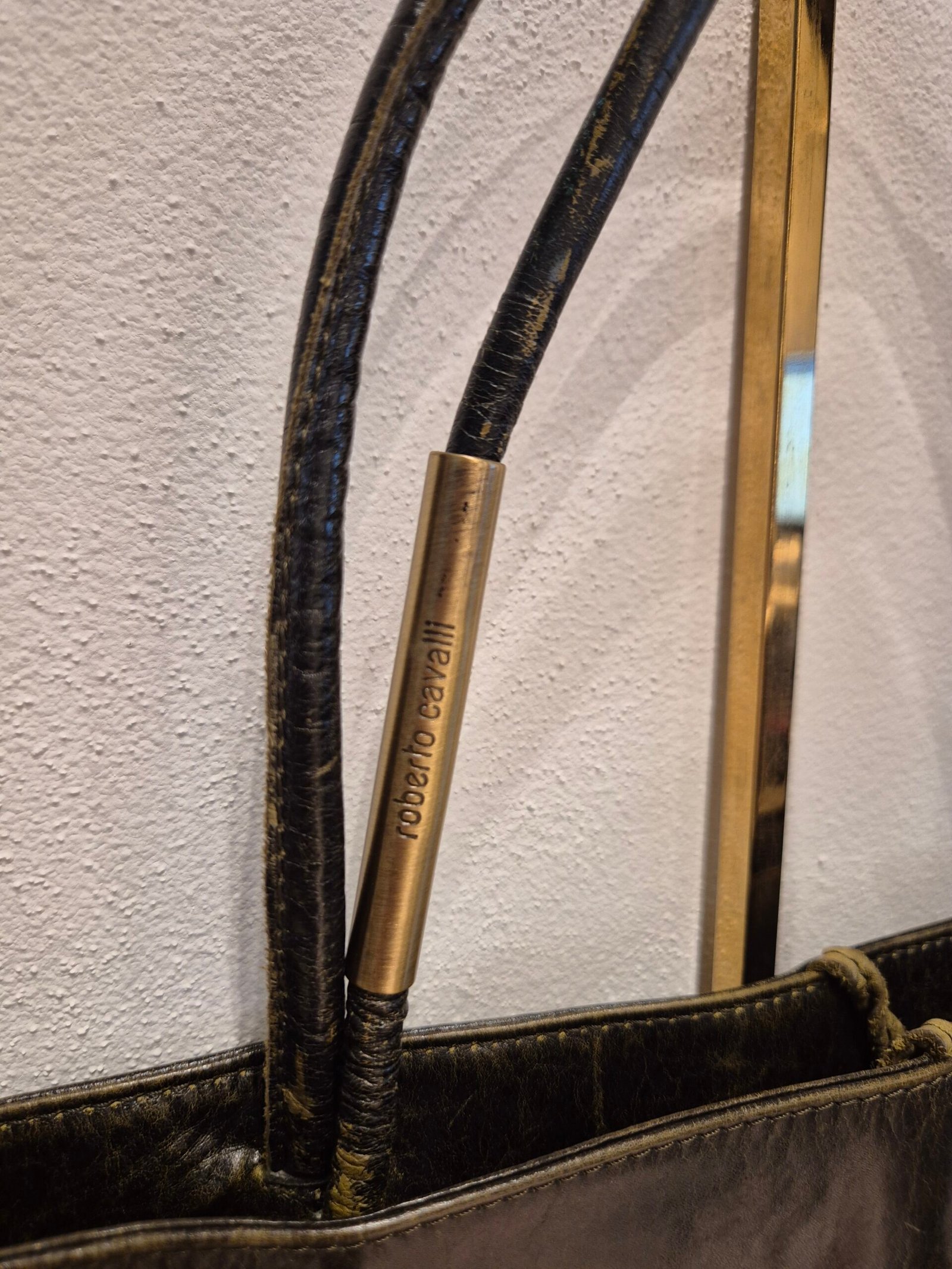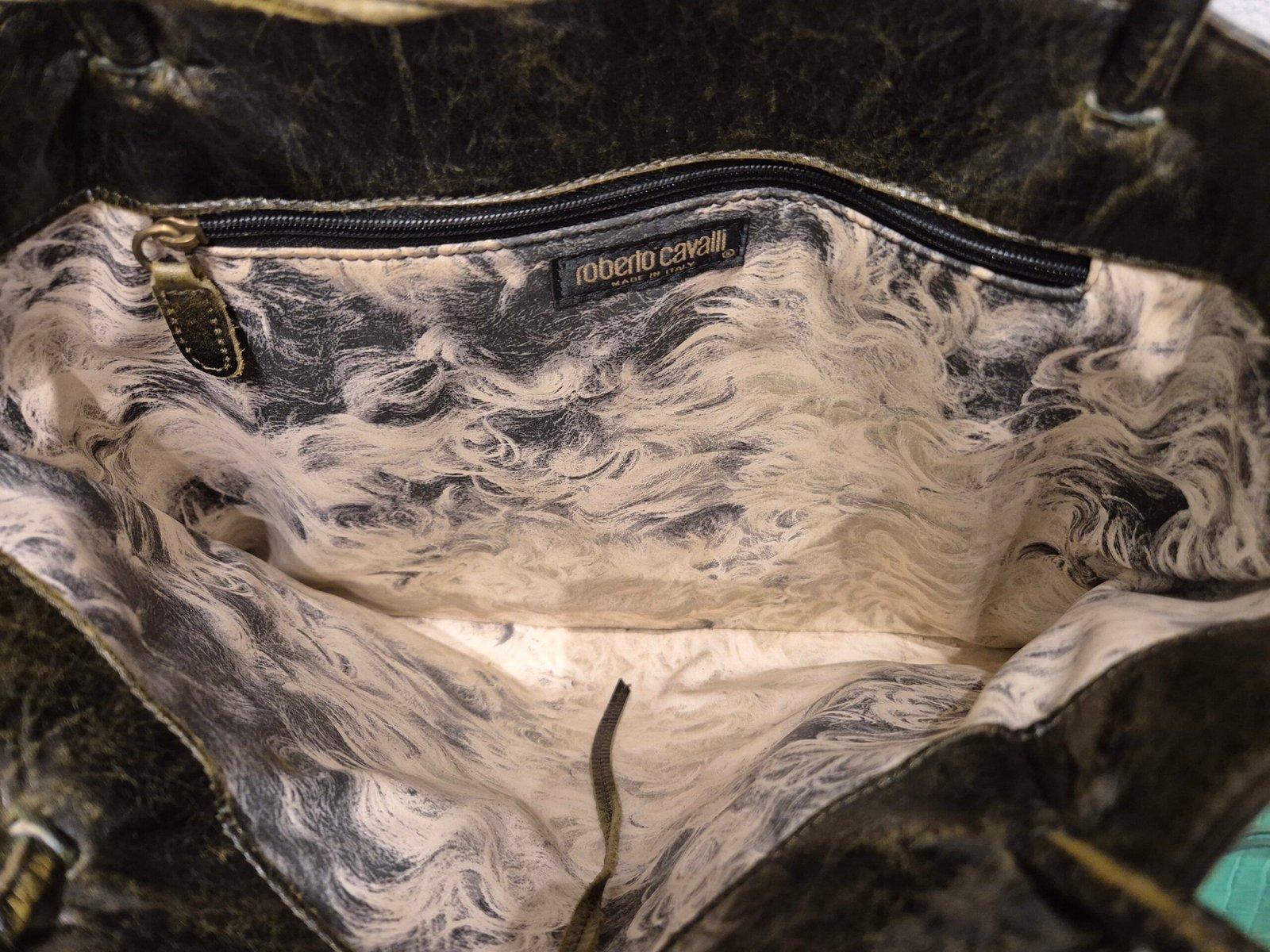 Borsa piatta in pelle colore verde scuro effetto vintage ed interno in seta stampa Roberto Cavalli.