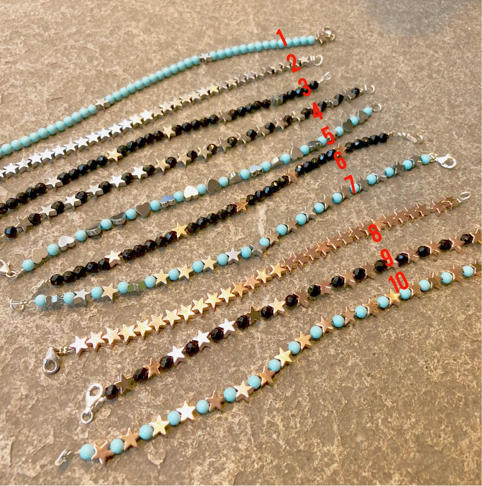 Il primo bracciale in alto è il numero 1 , l’ultimo in basso sarà quindi il numero 10 , controlla la terza foto per il numero se hai dei dubbi .